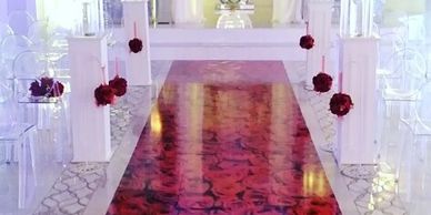 Aisles make a huge impression on your ceremony. We offer clean white aisle wraps or can print anything you would like on it, from flowers to collages to make a memory lane.